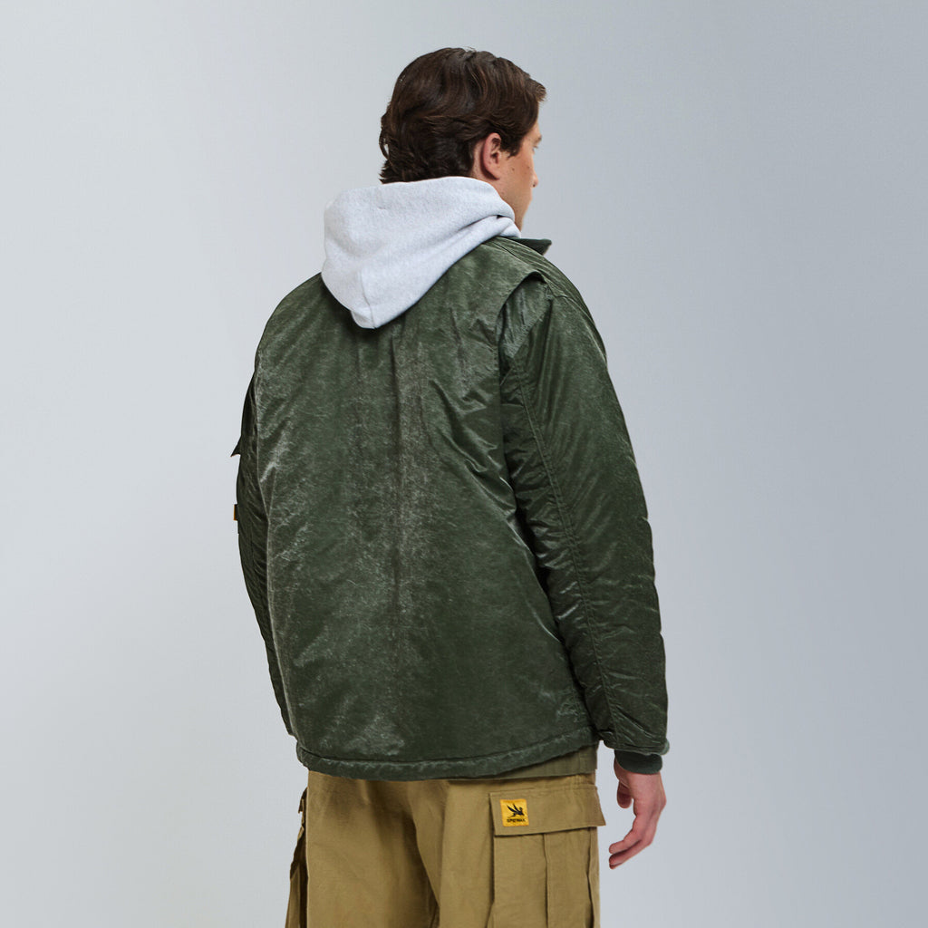 This modern version is crafted from a durable, thick nylon twill, specially treated with an aged finish to give it a unique, vintage character. This jacket combines authentic naval heritage with a rugged, worn-in aesthetic, making it a standout piece for any wardrobe.